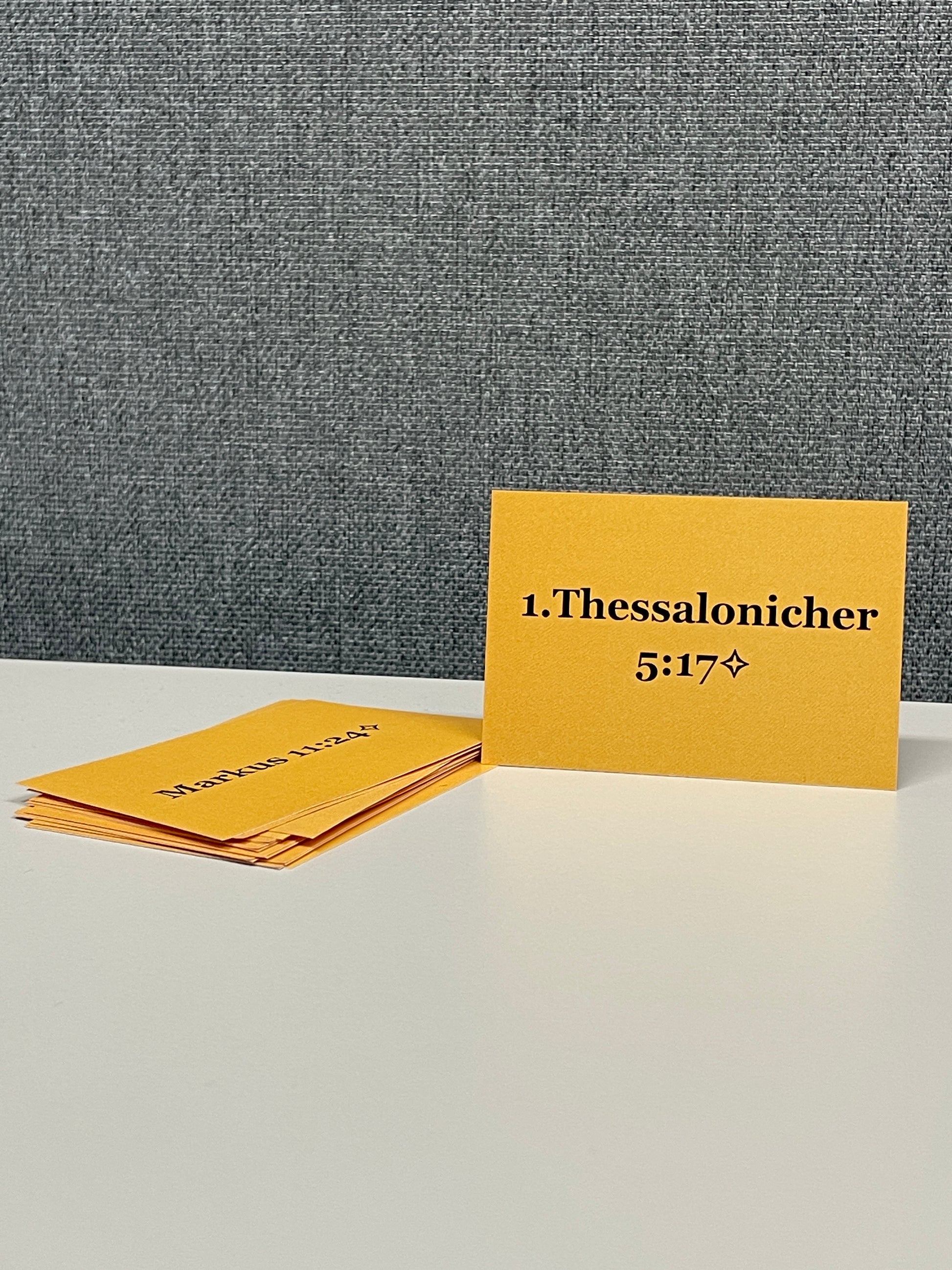 Jede Study Card ist doppelseitig gestaltet: Auf der Vorderseite findest du die Bibelstelle im klaren Design, auf der Rückseite den vollständigen Vers. Damit kannst du die Worte Schritt für Schritt auswendig lernen und sie dir als Fundament für deine geistliche Praxis aneignen.