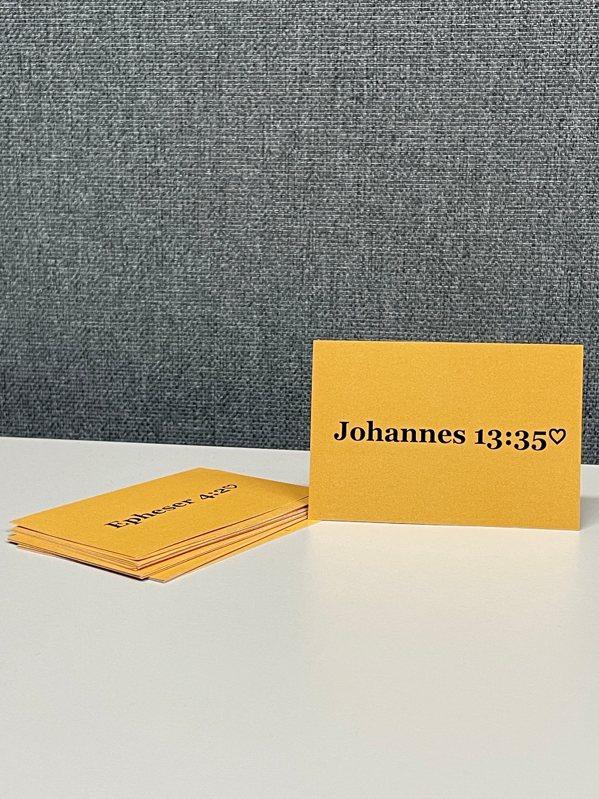 Alle Karten sind doppelseitig bedruckt: Auf der Vorderseite findest du die jeweilige Bibelstelle im klaren, minimalistischen Design, auf der Rückseite steht der vollständige Vers. Dadurch kannst du spielerisch auswendig lernen, wiederholen und die Inhalte fest im Gedächtnis verankern.